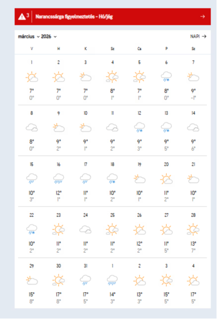 Március 15-e környékén jelentősebb csapadék érkezhet, ezt követően viszont ismét a napos idő dominálhat. A hónap második felében a maximumok már 10–12 fok köré emelkednek, majd az utolsó napokban hirtelen melegedés jöhet. Sok napsütés mellett akár 16–17 fokot is mérhetünk a hónap végén.