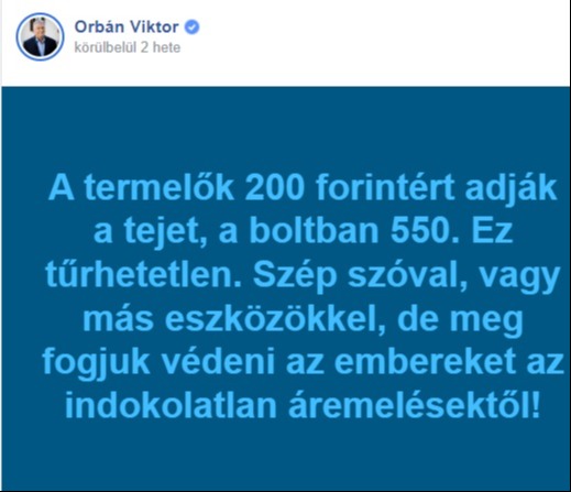 Pénteki bejelentésében rámutatott: a termelők mindössze 200 forintért adják a tejet, míg a boltokban 550 forintos áron érhető el. „Ez tűrhetetlen. Szép szóval, vagy más eszközökkel, de meg fogjuk védeni az embereket az indokolatlan áremeléstől” – hangsúlyozta a miniszterelnök.